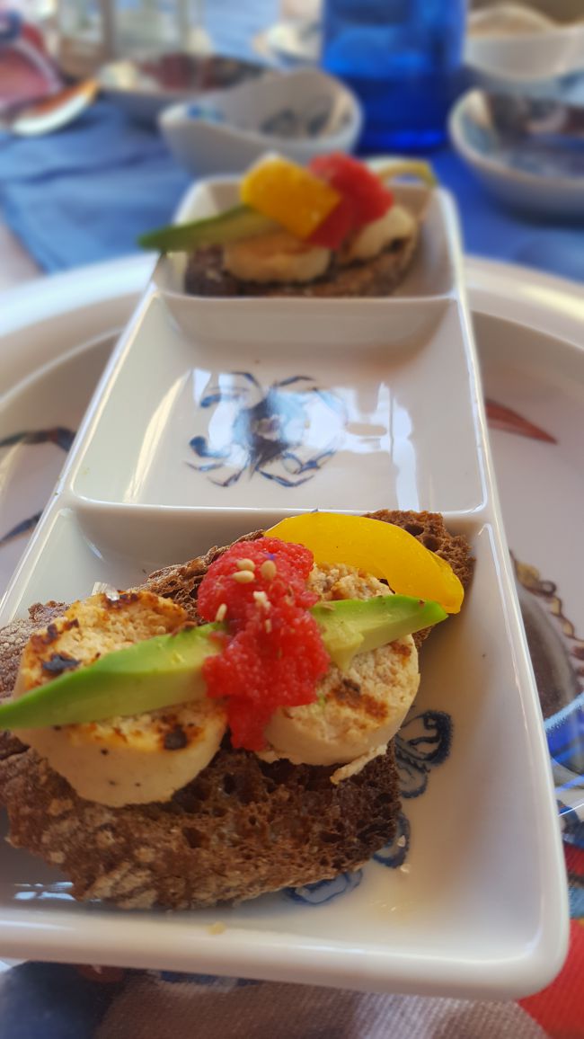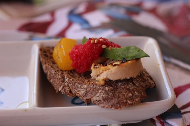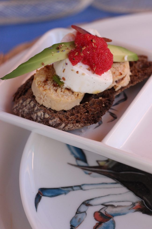 Tostadas de Huevas cocidas de merluza con perlitas de huevas de capelán en base de pimiento de colores.